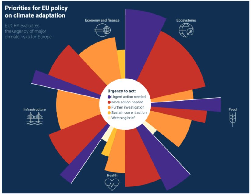 L’EUCRA ha seguito un processo sistematico di valutazione del rischio, per identificare ed analizzare i principali rischi climatici per l’Europa e determinare il “da farsi”, che ha portato a individuare e valutare 36 principali rischi climatici per l’Europa, raggruppati in cinque grandi cluster: ecosistemi, cibo, sanità, infrastrutture, economia e finanza.