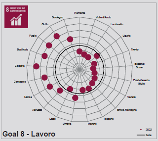 Il Goal 1 (Povertà), il Goal 8 (Lavoro e crescita economica), il Goal 10 (Disuguaglianze) e il Goal 17 (Partnership) sono invece quelli dove è più ampia la variabilità: in questi casi, ci sono regioni che assumono una posizione anche molto distante dalla media e si caratterizzano per elevati scostamenti dalle altre regioni.