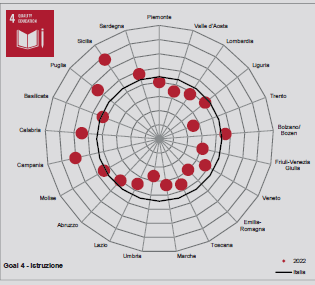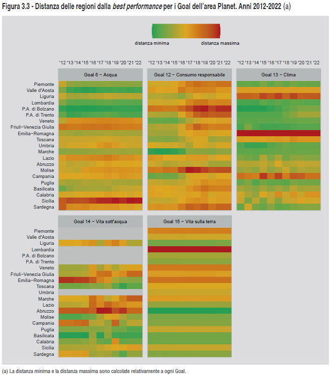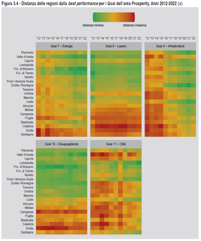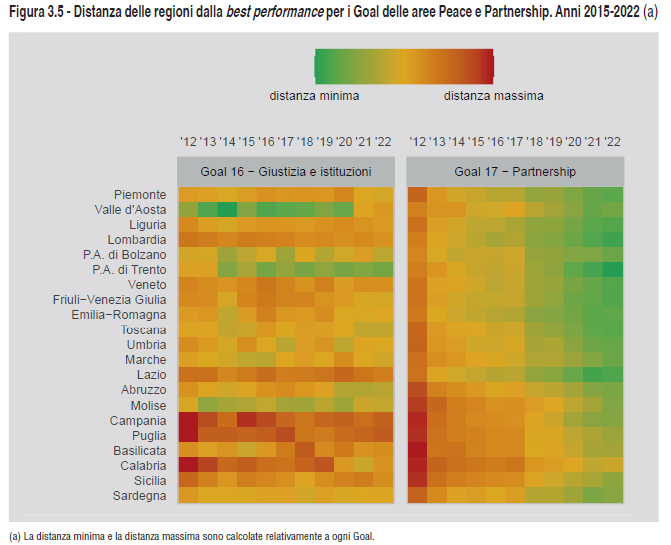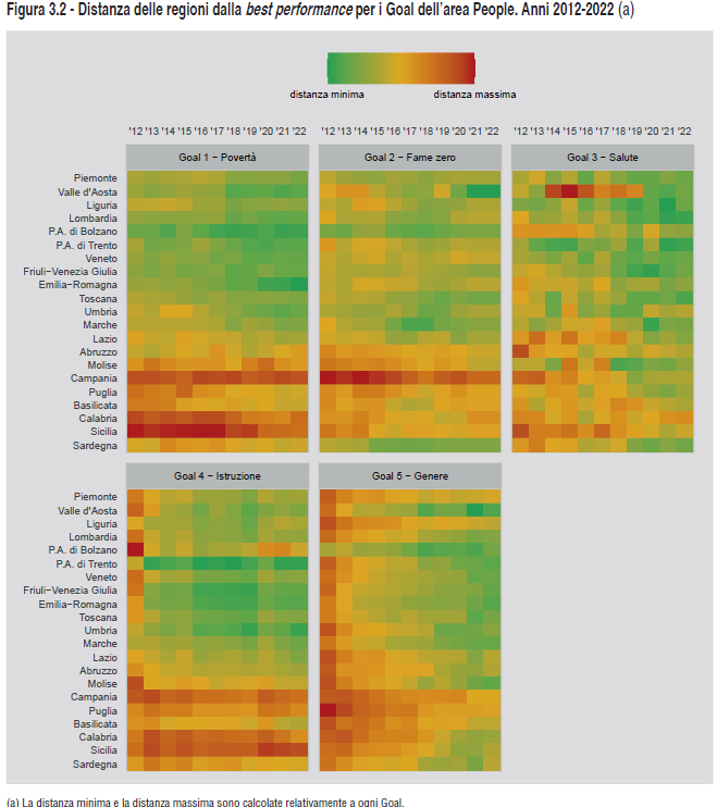 | “In ogni Goal, per ogni regione o Provincia Autonoma, per ogni anno (dal 2012 al 2022), la distanza dalla bp è rappresentata da un colore che varia dal verde più intenso (distanza minima della regione nel Goal considerato) al rosso più scuro (distanza massima), passando per il giallo. Tali “mappe di calore”, pur nella loro sintesi, forniscono una rappresentazione visiva immediata e facilmente interpretabile dei progressi delle disparità territoriali all’interno di ciascun Goal”. |