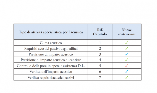 - l’Acustica edilizia riguarda i requisiti acustici delle strutture edilizie di divisione tra distinte unità immobiliari e con l’ambiente esterno, i requisiti acustici delle strutture edilizie interne alla stessa unità immobiliare e gli impianti tecnologici.