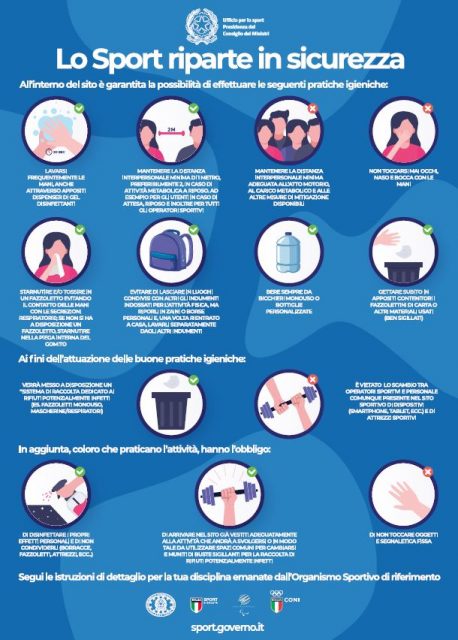 Il Ministero dello Sport, in linea con il dpcm del 17 maggio 2020, ha divulgato il documento di indirizzo “Linee guida per l’esercizio fisico e lo sport – Lo sport riparte on sicurezza: ognuno protegge tutti”.