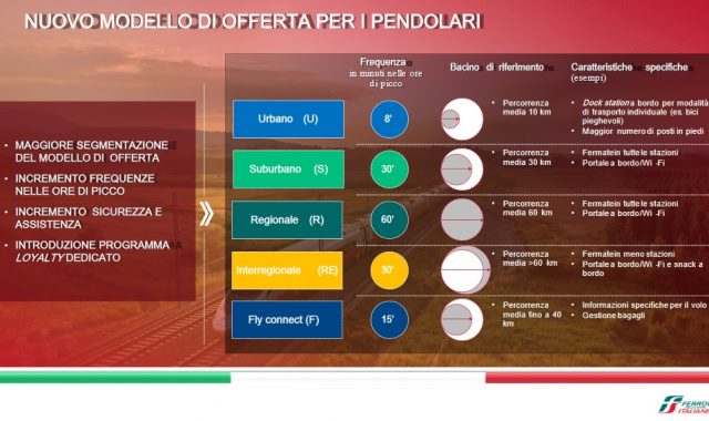 Servono soluzioni a corto e medio raggio per il trasporto ferroviario italiano. E il gruppo The European House – Ambrosetti in collaborazione con Ferrovie dello Stato Italiane ha presentato al forum di Cernobbio il rapporto ‘Investire nel trasporto ferroviario regionale’. Nel piano industriale FS i servizi per i pendolari sono classificati in cinque categorie, in base alle quali si auspica una suddivisione del materiale rotabile più idoneo. Ai servizi urbani (per i quali si prevede una frequenza di 8 minuti), suburbani, regionali, RegioExpress (che nelle ore di picco possono arrivare a frequenza di 30 minuti), si affiancano i servizi aeroportuali, la cui frequenza potrà raggiungere i 15 minuti.