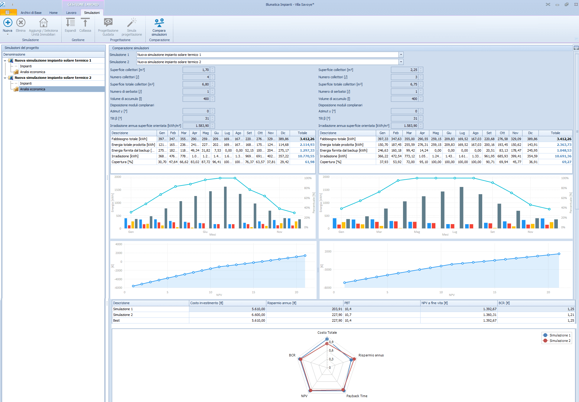 Grafici di riepilogo tecnici e professionali relativi all’analisi tecnico-economica, con possibilità di confronto tra le varie simulazioni e con riepilogo di grafico su competitività su ogni parametro per permettere all’utente di scegliere, in modo rapido, la migliore configurazione impiantistica per soddisfare ogni esigenza.