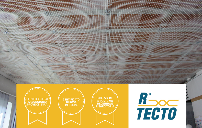 Il sistema R-TECTO® è certificato sia nel sistema che nella posa. Il sistema è stato sottoposto a rigidi test di laboratorio che ne hanno garantito l’efficacia e la tenuta in caso di sfondellamento. Una volta posato, alla fine di ogni intervento, vengono eseguiti test a campione per valutare l’efficacia del sistema installato, garantendo così anche la posa in opera.