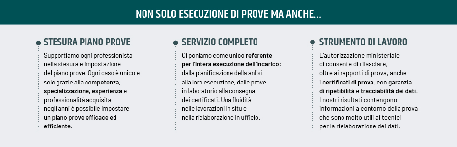 Il Laboratorio si occupa di eseguire e certificare prove sulle costruzioni esistenti per rilevare le caratteristiche costruttive delle strutture: tipologia degli elementi, geometrie e caratterizzazione meccanica dei materiali.