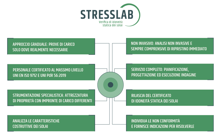 STRESSLAB®è il protocollo diagnostico che certifica l’idoneità statica dei solai. Attraverso approcci analitici e prove di carico valuta il comportamento strutturale dei solai e rilascia un documento che ne certifica o meno l’idoneità.