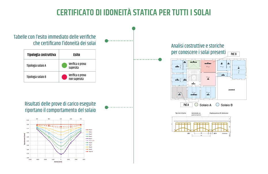 Al termine di ogni indagine, i tecnici del Centro Diagnostico Tecnoindagini elaborano i dati raccolti, e redigono il Certificato di idoneità statica dei solai, corredato da libretto sanitario sullo stato di salute degli impalcati. Questo documento, firmato e asseverato, contiene la relazione tecnica dettagliata, le caratteristiche costruttive dei solai, le tabelle con i risultati delle verifiche svolte, il giudizio immediato sull’idoneità dei solai. Inoltre, in caso di criticità riporta le informazioni necessarie ai tecnici per individuare le carenze e le cause.
