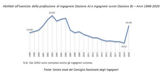 Dall’analisi del centro studi del CNI si legge “A questo rinnovato interesse per l’acquisizione dell’abilitazione professionale corrisponde tuttavia solo in parte un incremento delle iscrizioni all’Ordine. Degli oltre 14mila abilitati alla professione di ingegnere del 2020, solo 6.600 circa risultano, ad oggi, iscritti all’albo, un numero sì superiore rispetto a quello registrato negli anni precedenti, ma non nelle dimensioni che ci si poteva attendere dato l’exploit rilevato per quanto concerne numero di abilitati.”