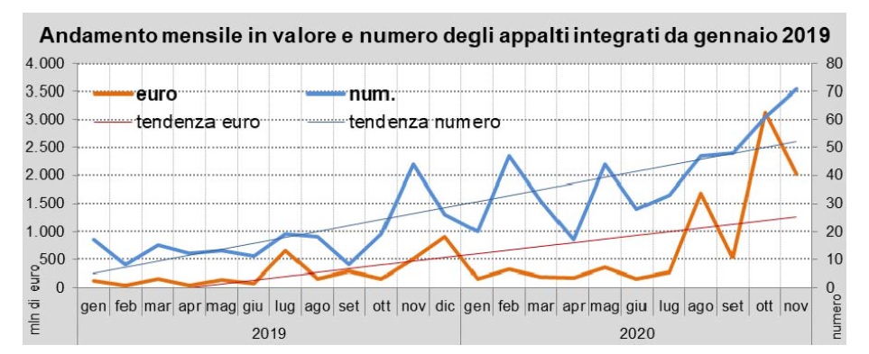 Negli undici mesi del 2020 i bandi pubblicati sono stati 5.763 per un valore di 1.969,8 milioni di euro, +9,8% in numero e +48,5% in valore rispetto ai primi undici mesi del 2019. Il grafico mette in evidenza la forte crescita della linea di tendenza del valore.
