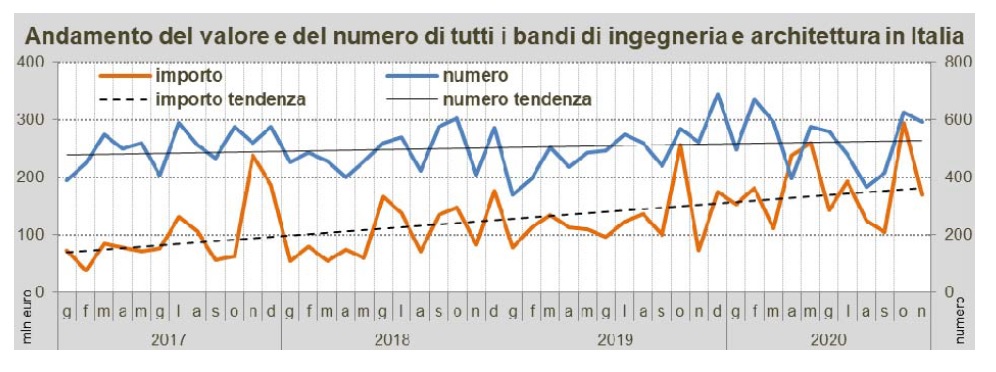 Il mercato di tutti i servizi di ingegneria e architettura in novembre ha un andamento in calo rispetto al mese precedente, le gare pubblicate sono state 592 per un valore di 169,9 milioni di euro, -5,3% in numero e -42,3% in valore sul precedente mese di ottobre, mese record dell’anno. Ma rispetto a novembre 2019 il numero cresce del 13,4% e il valore del 132,9%.