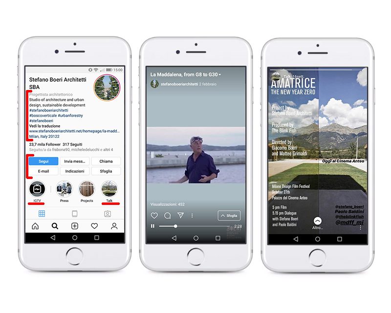 Lo studio Stefano Boeri Architetti su Instagram: da sinistra a destra la descrizione del profilo con le informazioni dei contatti, un filmato preso dall’IGTV riguardante il progetto per l’ex Arsenale dell’isola di La Maddalena (Sardegna) e una delle Stories relativa al cortometraggio sulla ricostruzione di Amatrice firmata dall’archistar