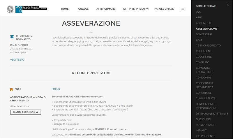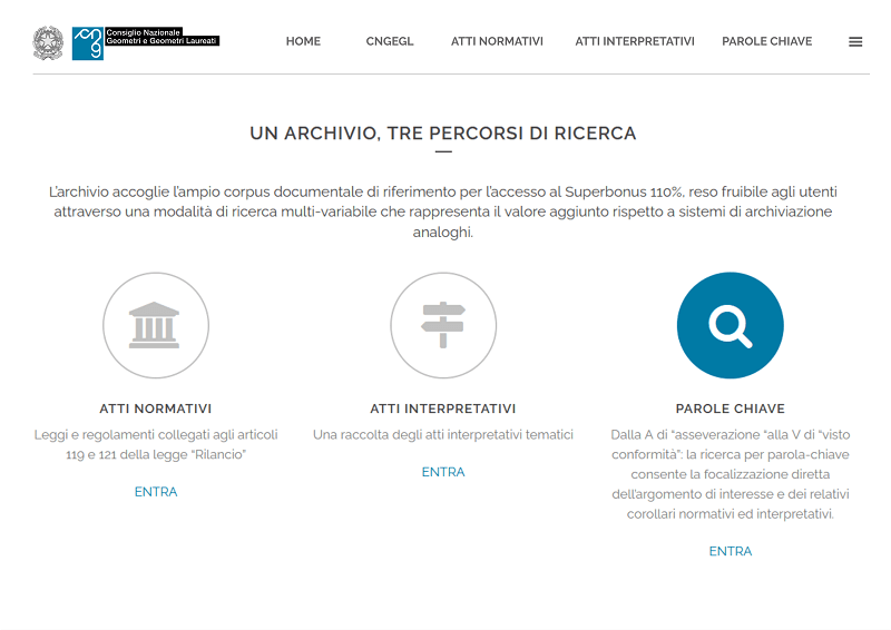 In primo piano nel sito viene dato risalto all’archivio in cui sono collocati tutti i documenti finora pubblicati da ogni fonte ufficiale sul Superbonus 110%. La pubblicazione è in ordine cronologico e la funzione di ricerca è per atto normativo, atto interpretativo e per parola chiave. Questo criterio consente di trovare sempre il testo richiesto, che per gli atti interpretativi è implementato anche da un’icona colorata, per identificarne più facilmente l’ente pubblico di provenienza, e un link che permette di individuare facilmente il passaggio del testo in cui si trova la parola ricercata.