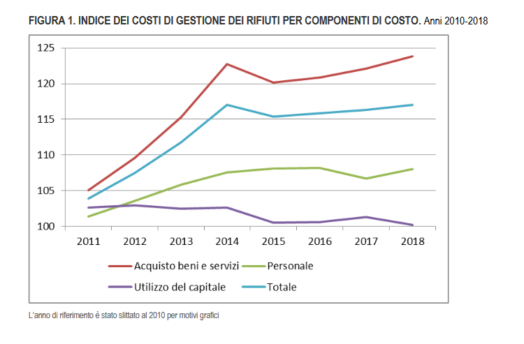 Rispetto al 2017 il costo di gestione dei rifiuti risulta in aumento dello 0,6%, trainato dagli acquisti di beni e servizi (+1,4%), a fronte di riduzioni per le spese del personale (-1,2%) e del costo d’uso del capitale (-1,0%).