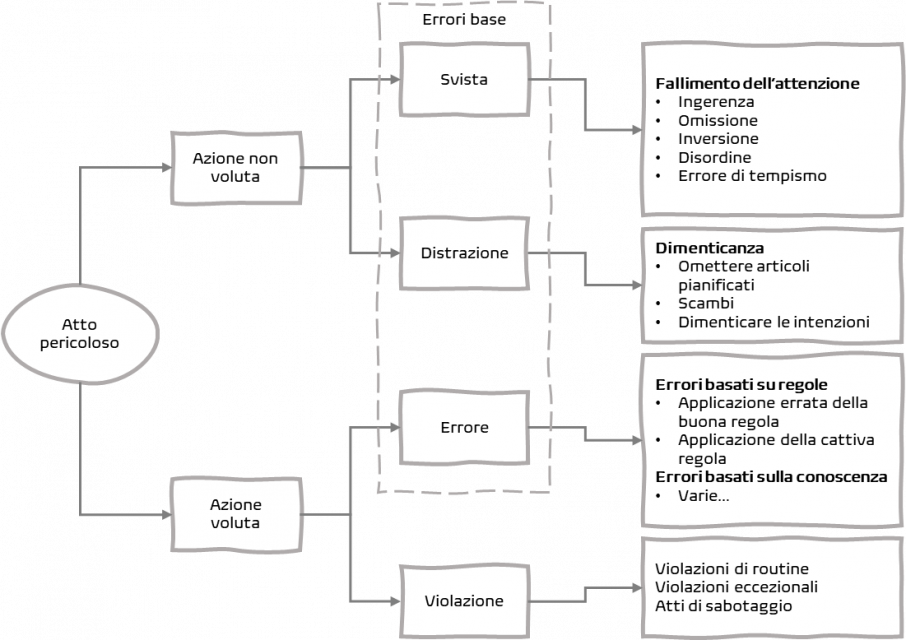 Il lavoro di Reason, che si è sviluppato principalmente tra gli anni ’80 e ’90 del secolo scorso, invero, è molto più ampio e articolato. Particolarmente interessanti sono le sue riflessioni sulla tassonomia degli atti pericolosi, molto meno diffuse in Italia del modello del formaggio svizzero, ma che fanno parte dei syllabus dei percorsi di certificazione delle associazioni professionali britanniche. La tassonomia degli atti pericolosi intende distinguere tra le azioni volontarie e involontarie delle funzioni cognitive, quelle che vengono utilizzate per la pianificazione, la memorizzazione e l’esecuzione delle attività lavorative.