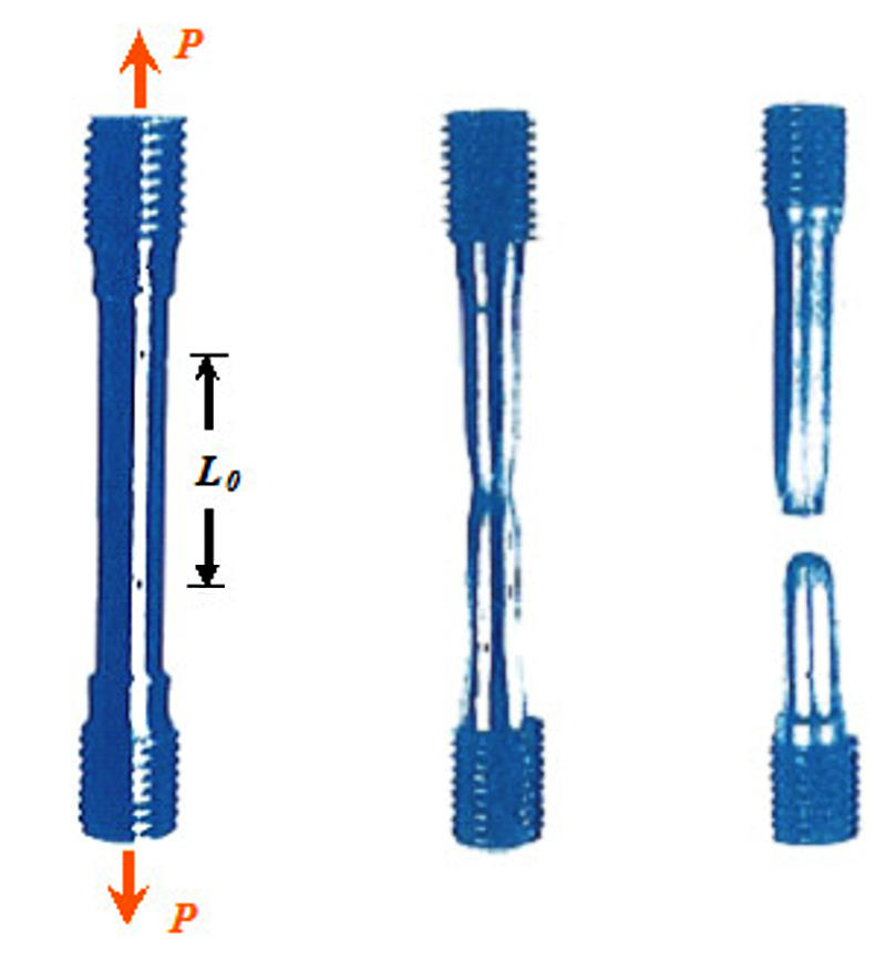 Tipicamente l’allungamento di un materiale viene valutato sperimentalmente sottoponendo un campione, in genere cilindrico, a un regime monoassiale di tensioni di trazione attraverso l’applicazione di due forze P assiali uguali e opposte agli estremi del campione (si veda, in figura, un esempio di prova di trazione eseguita su un provino di acciaio). Nella fase di comportamento elastico del materiale, l’allungamento è pari a PLo/EA, dove E è il modulo di elasticità del materiale e A è l’area della sezione trasversale del provino. Ad esempio, per un acciaio strutturale in fase elastica l’allungamento unitario è inferiore allo 0,2%, mentre in fase plastica raggiunge a rottura valori dell’ordine del 20%.