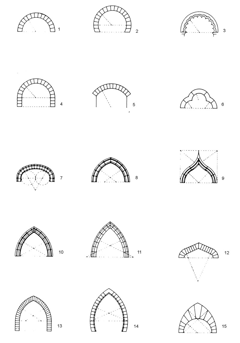 Considerando l’andamento della curva d’intradosso in relazione al proprio sesto (o profilo) definito come rapporto tra freccia e metà della luce, gli archi si distinguono in: archi a tutto sesto (pieno sesto o pieno centro, tondi) in cui la freccia è pari a metà della luce e la curva d’intradosso è una semicirconferenza; archi a sesto rialzato (eccedente o oltrepassato), la cui freccia è superiore a metà corda (archi a ferro di cavallo, archi a sesto acuto lanceolati, archi polilobati, archi con curva d’intradosso composita inflessi o carenati); archi a sesto ribassato (scemi, tondi ribassati, a monta depressa, schiacciati o diminuiti), il cui intradosso è un tratto di semicirconferenza con il centro a quota inferiore alle imposte e con freccia inferiore a metà corda (archi rovesci). Gli archi policentrici, composti, asimmetrici, derivano la loro forma dalla posizione dei centri di curvatura che possono essere lungo la linea d’imposta (arco acuto), sopra di essa (arco lanceolato), in bande opposte rispetto all’intradosso (arco inflesso o carenato) o ad altezze diverse (arco polilobato). Per ciascuno di questi archi diversi sono i metodi di tracciamento e di costruzione.