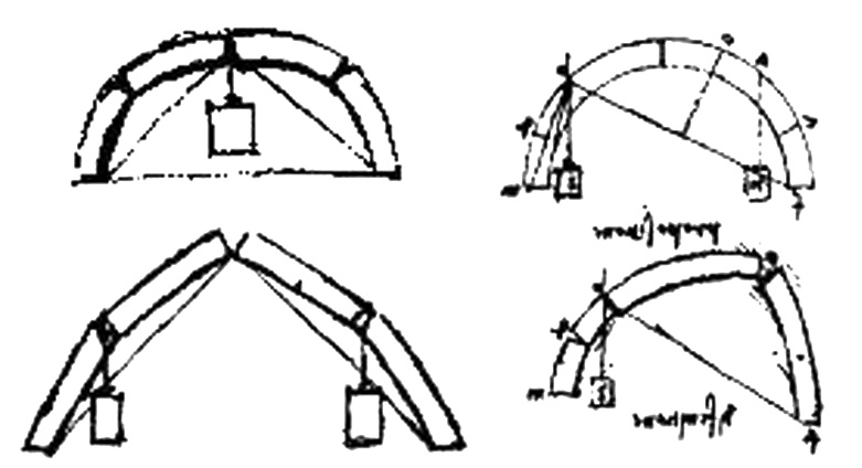 La coincidenza tra asse dell’arco e curva delle pressioni garantisce che le forze scambiate tra i conci costituenti siano semplicemente di compressione in ogni sezione; maggiore è la distanza tra le due curve e più la risultante dei carichi in ogni sezione risulterà inclinata rispetto alla perpendicolare condotta per il piano della sezione stessa, e lontana dal suo baricentro, determinando l’insorgere di un momento flettente.