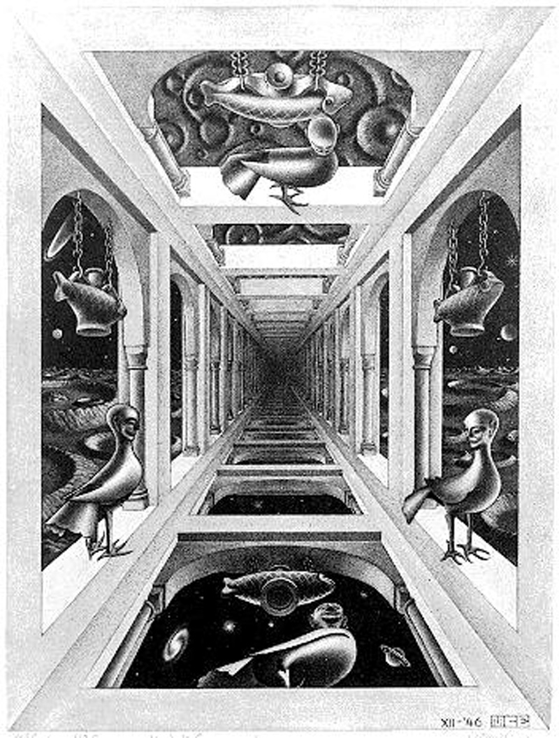 Nel primo caso, per “fuga” si intende la successione regolare di elementi simili sempre più lontani: fuga di stanze, di archi, di alberi indica la loro disposizione in serie numerosa e fitta lungo una dirittura osservabile in prospettiva. Fuga è anche il punto evanescente verso il quale sembrano convergere gli oggetti allineati e le rette che li collimano quando, nel loro susseguirsi, diventano indistinguibili per la grande distanza. In tali accezioni è un luogo fisico indefinitamente lontano ma identificabile, assimilato per le rette orizzontali ad un punto all’orizzonte. È il punto di convergenza delle rotaie e quello in cui si annulla la dimensione apparente delle case in fondo ad un lungo rettifilo.