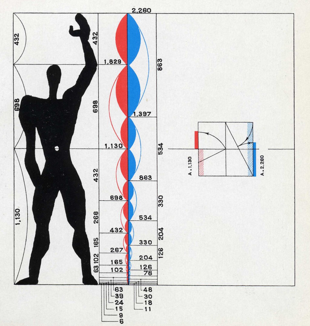 nombre d’or numero aureo), sistema di proporzionamento da applicare sia alla progettazione architettonica sia alla produzione industrializzata, alla grande come alla piccola scala, al fine di ottimizzare la congruenza estetica e funzionale tra uomo e spazio costruito. Tale sistema si compone di due serie armoniche di misure (serie rossa e serie blu), ricavate mediante successive divisioni secondo il numero aureo φ=1.618, rispettivamente a partire dalla statura dell’uomo, assunta convenzionalmente pari a 183 cm, e dall’altezza dello stesso uomo con il braccio alzato, assunta convenzionalmente pari a 226 cm. Le misure che compongono le due serie costituiscono un abaco dimensionale cui attingere per il proporzionamento dello spazio architettonico, interno ed esterno.