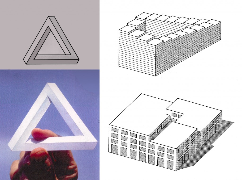 Il pensiero “gestaltico” si collega a varie questioni di percezione della realtà molto dibattute, quali le distorsioni dimensionali apparenti e i problemi di valutazione della profondità (A. Ames), le illusioni ottiche” o, meglio, le “illusioni percettive” (R.L. Gregory), le cosiddette “figure ambigue” e le “figure impossibili” utilizzate spesso sia a sostegno della