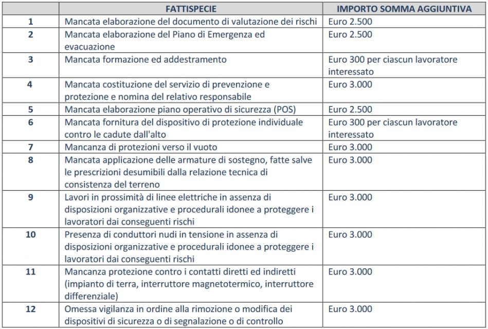 Nei casi di sospensione per motivi di tutela della salute e della sicurezza sul lavoro la somma aggiuntiva è indicata nell’Allegato I in riferimento a ciascuna violazione.