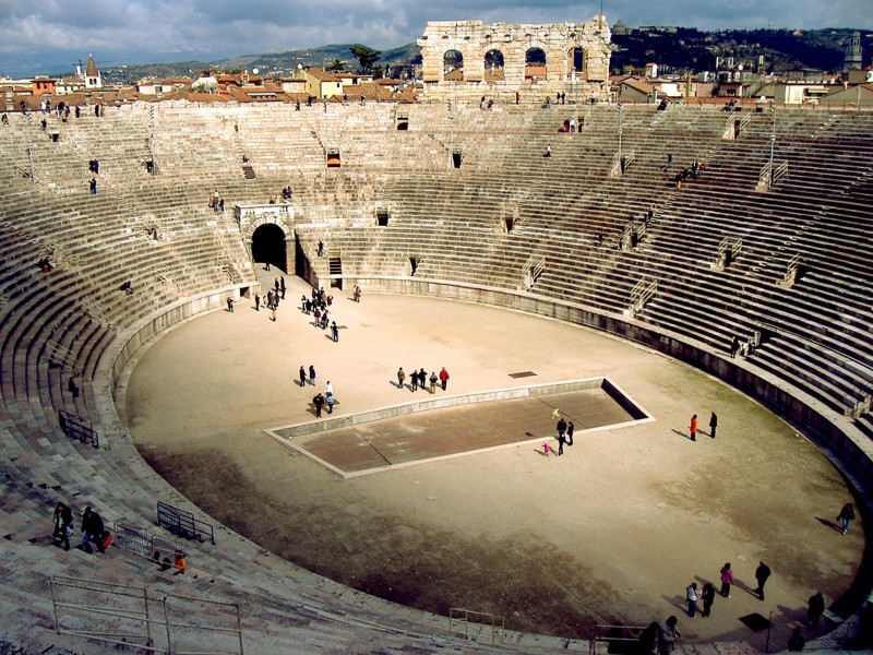 circo), cosparso di sabbia perché fosse assorbito il sangue versato durante i noti cruenti spettacoli e perché i cavalli non venivano ferrati. Arena indicava anche l’intero anfiteatro, mai un circo o uno stadio; parallelamente, il teatro veniva sinteticamente indicato come
