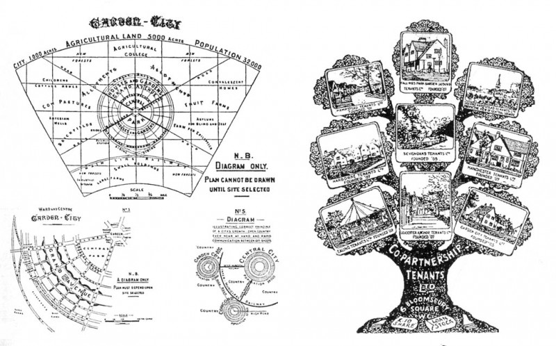 La città giardino howardiana scaturisce dalla sintesi razionale di proposte e tendenze già in atto: da quelle degli utopisti (in particolare Robert Owen, 1771-1858) a quelle del movimento cooperativista inglese, dalle Company town di Saltire (1850), Port Sunlight (1888) e Bournville (1895) alla tradizione del Garden suburb borghese, come Bedford Park (1875-1886), dal socialismo moderato di William Morris (1834-1896) e del fabianesimo al modello di società egalitaria descritto dallo scrittore statunitense Edward Bellamy (1850-1898), che tanto aveva colpito Howard. Questi si pone un duplice obiettivo: salvare la città dalla congestione e dallo sviluppo incontrollato “a macchia d’olio” ed evitare l’abbandono della campagna; così la sua proposta riunisce, in un solo insediamento, le comodità della vita urbana e gli aspetti positivi della vita di campagna.
