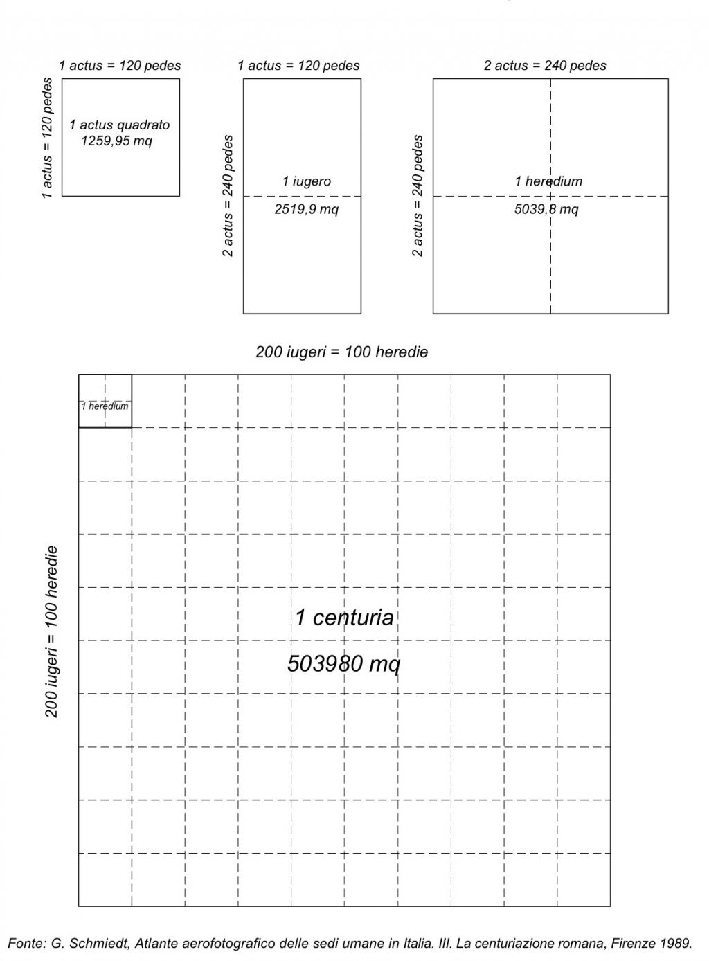 Gagliardo G.B., Vocabolario agronomico italiano …, Milano, 1822; Mazzi A., Nota metrologica. Un ragguaglio milanese del secolo IX fra lo iugero romano e il longobardo, in «Archivio Storico Lombardo», XXVIII, 1961, pp. 351-359; Misurare la terra: centuriazione e coloni nel mondo romano, Modena, 1984; Quilici L., S. Quilici Gigli S., Introduzione alla topografia antica, Bologna, 2004; Schmiedt G., Atlante aerofotografico delle sedi umane in Italia. Parte terza: La centuriazione romana, Firenze, 1989; Tanara V., L’economia del cittadino in villa. La Terra, Libro VI, Bologna, 1651, p. 427.
