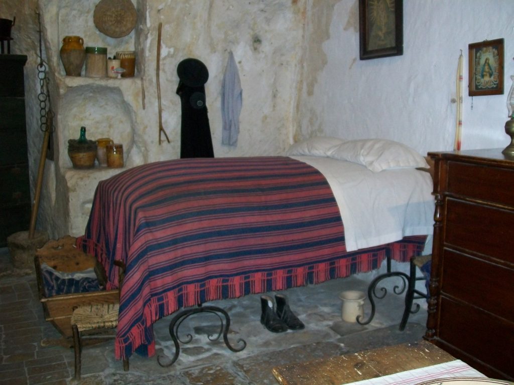Nell’ambito della tipologia residenziale, l’abitazione troglodita, vero e proprio archetipo organico di tutte le altre forme di alloggio, si distingue, in specie, per il suo carattere “anti-geometrico”, determinato dallo stretto legame con i fattori geo-morfologici del territorio che la ospita e, in sostanza, costantemente presente dalle origini fino ai giorni nostri, come dimostra il noto habitat rupestre dei “Sassi” di Matera, ancora oggi in uso e diviso in due quartieri detti “Caveoso” e “Barisano”. Qui, infatti, il tipo dell’abitazione troglodita risulta aver attraversato la storia dell’architettura locale ignorandone, per lo più, i progressi formali e tecnico-costruttivi, fatto salvo qualche sporadico motivo decorativo aggiunto alle facciate, soprattutto in età barocca. Scavate lungo i ripidi fianchi d’una profonda gravina calcarea e aggregate in unità munite d’uno spazio centrale comune, le case si distribuiscono affiancate e sovrapposte con una logica che, data la natura impervia del luogo, asseconda principalmente la necessità pratica dell’accessibilità, con i percorsi ricavati spesso sui loro stessi tetti. Il tipo ricorrente comprende un ambiente unico adibito a tutte le attività, con le suppellettili e il letto al centro e la cucina in prossimità del vano d’accesso; varianti a tale schema elementare sono date dall’aggiunta di locali laterali, adibiti al riposo dei figli adulti oppure, soprattutto in età medievale, a stalla.