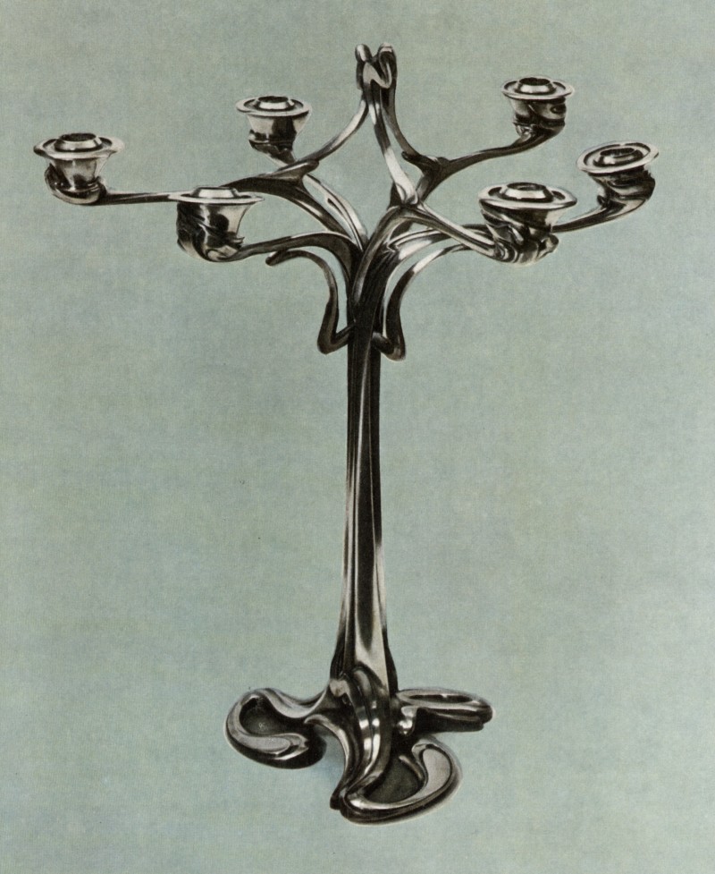 Il candelabro in argento di Henri van de Velde (1900) è un esempio della fusione tra struttura e decorazione da Ven de Velde stesso teorizzata. La sintesi costruttivo-funzionale prende vita dal materiale impiegato, la cui malleabilità consente di infondere vita estetica all’oggetto attraverso la linea-forza che ne mette in evidenza le prerogative d’uso e l’implicito significato psicologico.