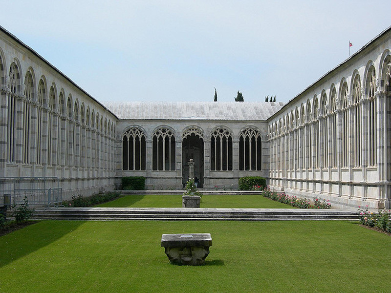 In questa definizione sembra essere implicito il riferimento a un esempio ben preciso – il Camposanto di Pisa – celebre sin dal Medioevo non soltanto per il valore della sua architettura, degli affreschi (tra gli altri, il Trionfo della Morte e il Giudizio Universale, entrambi di Bonamico Buffalmacco, o la Cosmografia di Piero di Puccio) e delle sculture, ma anche per la particolare sacralità della terra del suo campo di sepolture portata, come narrano le cronache, dall’arcivescovo Ubaldo Lanfranchi dopo una Crociata nel 1200 da quel terreno nei pressi di Gerusalemme denominato Aceldama, ovvero “campo di sangue” perché comprato dai sacerdoti ebrei con i trenta denari che Giuda ottenne dal tradimento di Gesù e in seguito utilizzato per la sepoltura dei pellegrini.