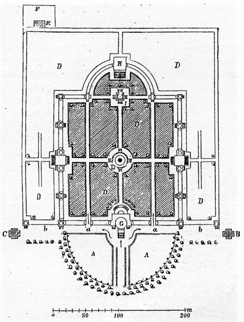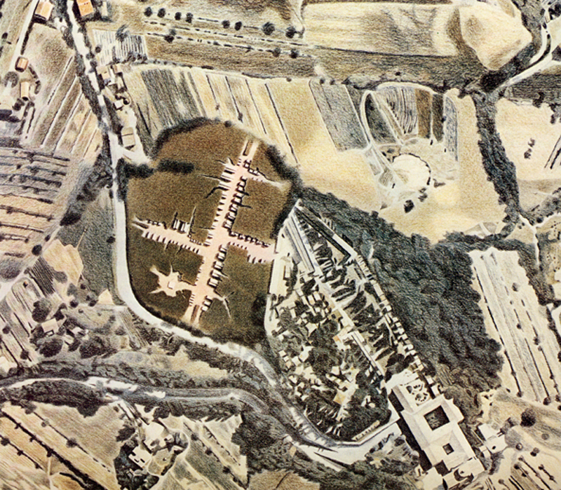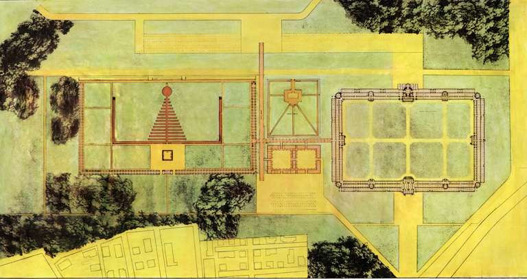 limes della società moderna, perimetro invalicabile e simbolico, inizialmente un semplice muro trasformato poi, sul tipo delle strutture conventuali, in struttura più complessa caratterizzata da una sequenza di portici e cappelle); degli accessi (le porte attraverso cui celebrare i riti di passaggio); dei percorsi esterni (i viali di collegamento con la città) e interni (direzionalità principali e secondarie); del centro della figura geometrica (punto privilegiato,