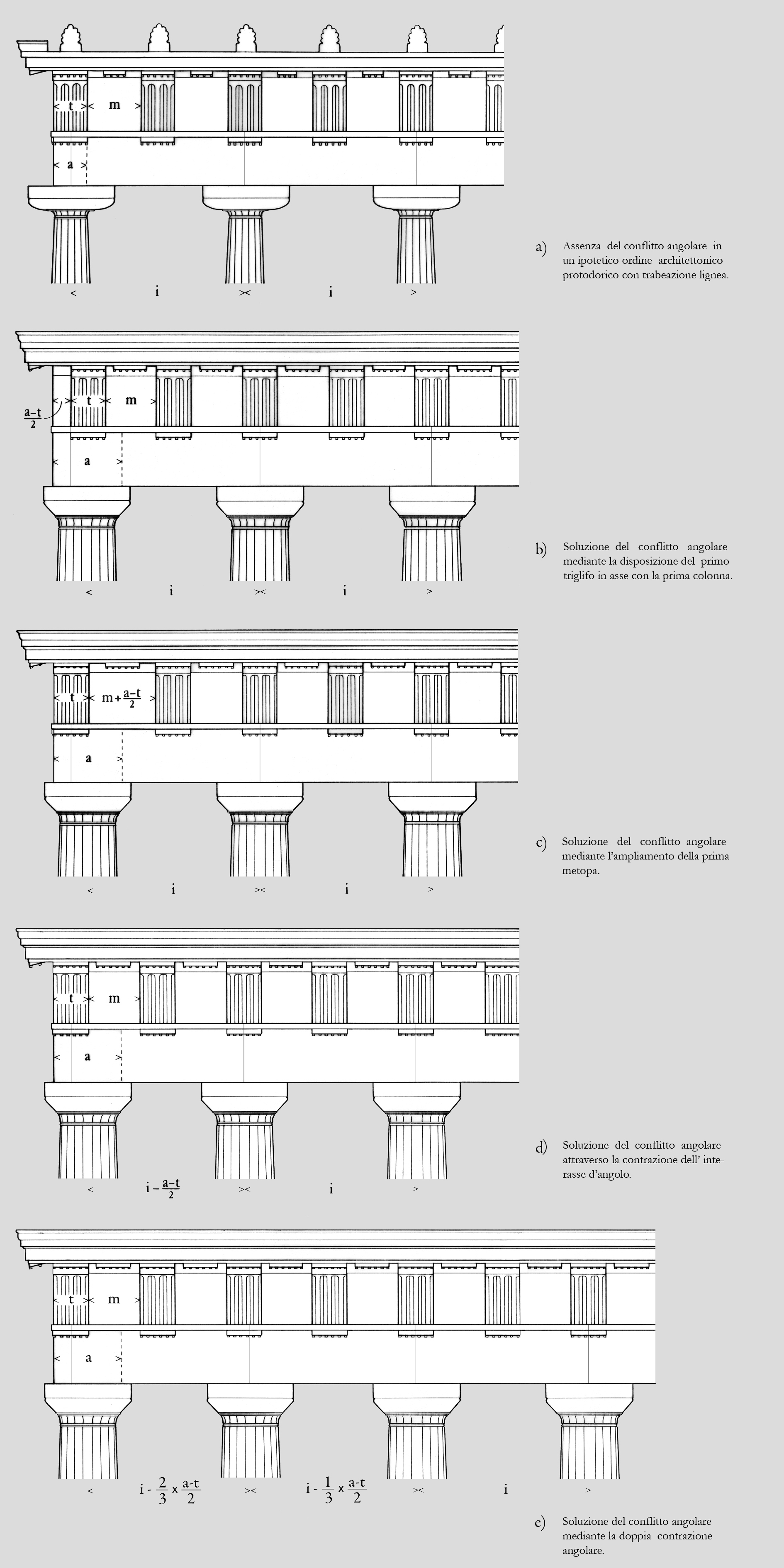 Rapportare l’ampiezza del triglifo allo spessore dell’architrave avrebbe significato alterare le proporzioni dell’ordine e la traslazione all’interno dell’architrave avrebbe generato problemi statici. La soluzione vitruviana di porre il primo triglifo in asse con la colonna e in angolo una parte di metopa pari alla metà della differenza fra larghezza del triglifo e spessore dell’architrave (v. disegno b della figura) è sconosciuta al mondo greco, ma nota a quello romano.