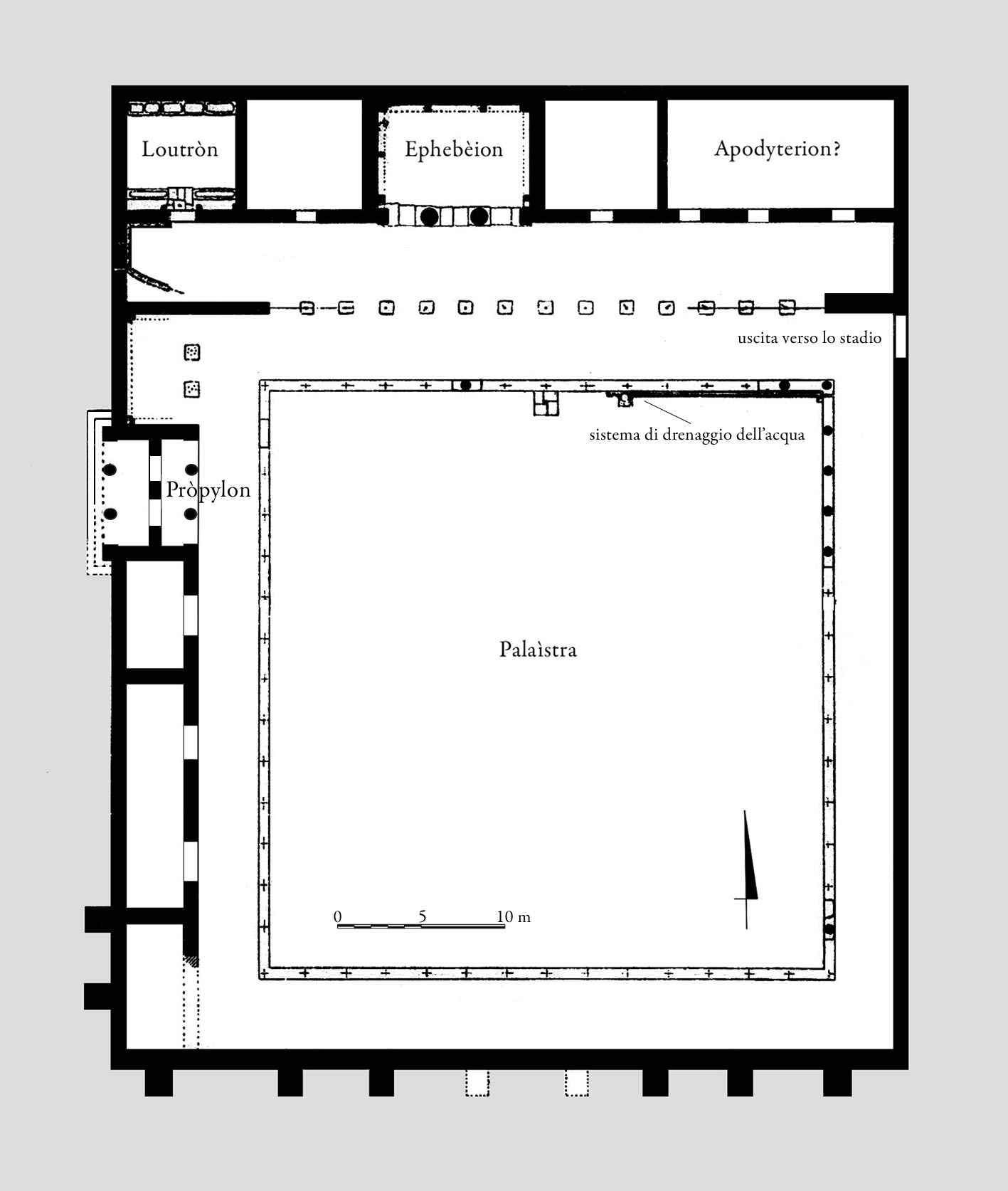 Il ginnasio è composto da una corte porticata, la palaìstra, accessibile da un propileo e pavimentata di terra battuta; sui portici affacciano vani il cui diverso impiego è noto da Vitruvio (V,11), il quale fornisce la terminologia di ciascun tipo di ambiente in base al suo utilizzo. Il più importante, destinato a lezioni e conferenze, è l’ephebèion, di solito situato in posizione assiale e configurato come una grande esedra aperta sul portico con un diaframma di colonne (Priene, Olimpia, Mileto). Esistono poi installazioni per il bagno (loutròn), sale per l’addestramento sportivo (korykeion e sphairistèrion, quest’ultimo noto da altre fonti) o per le aspersioni di olio e sabbia (konistèrion); l’elaiothèsion era poi il deposito dell’olio per ungere il corpo, molto dispendioso e di cui si faceva un uso intensivo. Altro ambiente noto da fonti diverse da Vitruvio è lo spogliatoio (apodytèrion), presente in ogni impianto di palestra-ginnasio. In connessione con un ginnasio, vi può essere anche un vero e proprio stadio, o uno stadio per gli allenamenti (paradromìs), oppure un portico misurato per l’esercizio della corsa al riparo (xystòn).