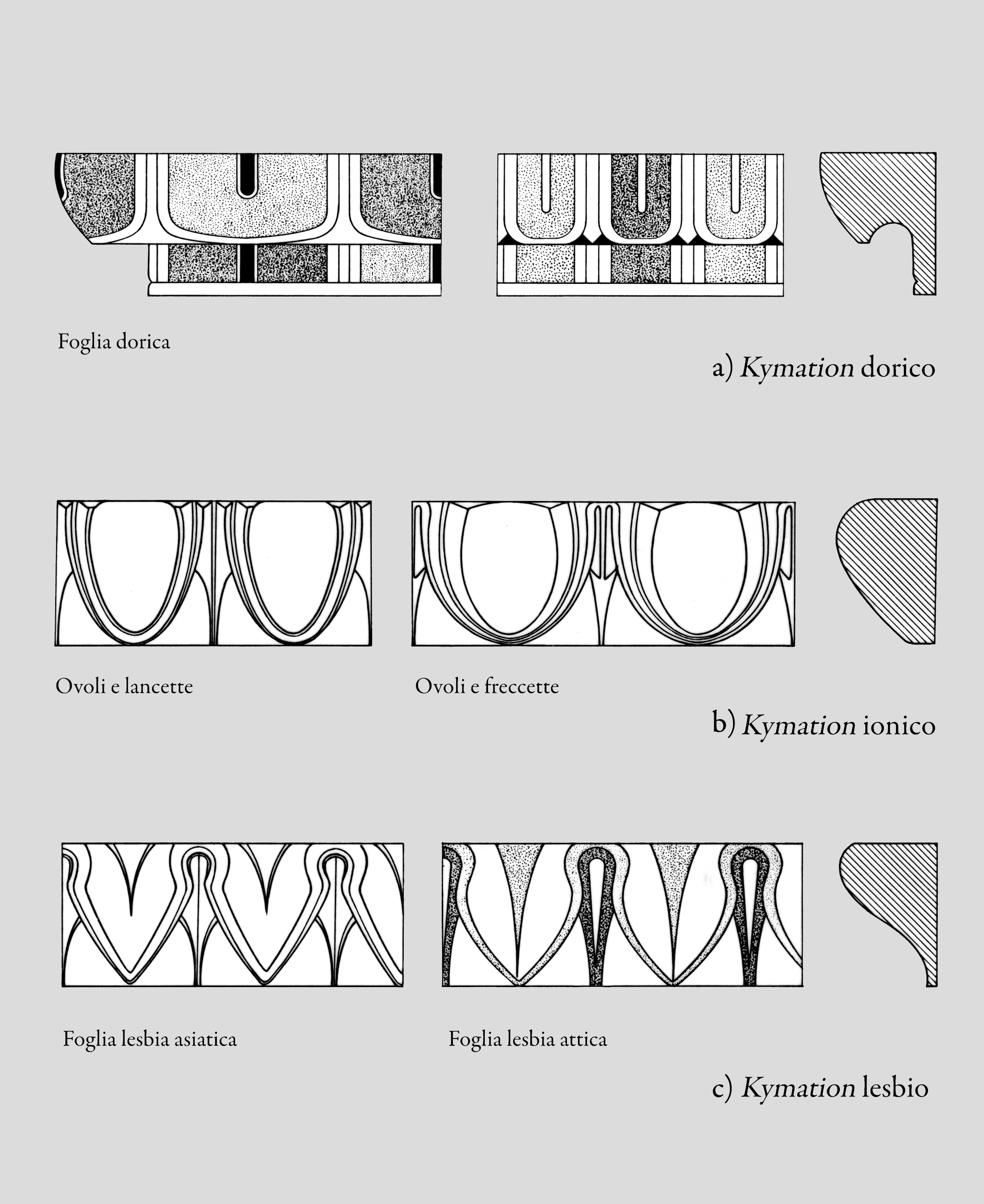 Il kimation dorico, modanatura dorica per eccellenza, utilizzata solitamente a coronamento di parti alte, gocciolatoi e capitelli d’anta, è costituito da un profilo a becco di civetta associato al motivo decorativo, spesso dipinto, della “foglia dorica”, ovvero una foglia d’acqua incurvata alla sommità.