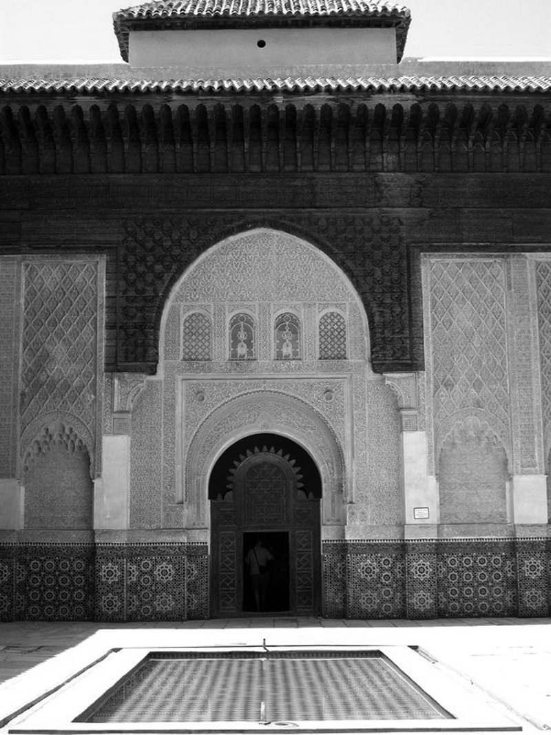 madrasa di Ben Jusuf a Marrakes (1564-1565), edificio la cui corte di 15×20 m è dotata di vasca centrale, porticati laterali e piccoli patii che illuminano gli ambienti laterali; le