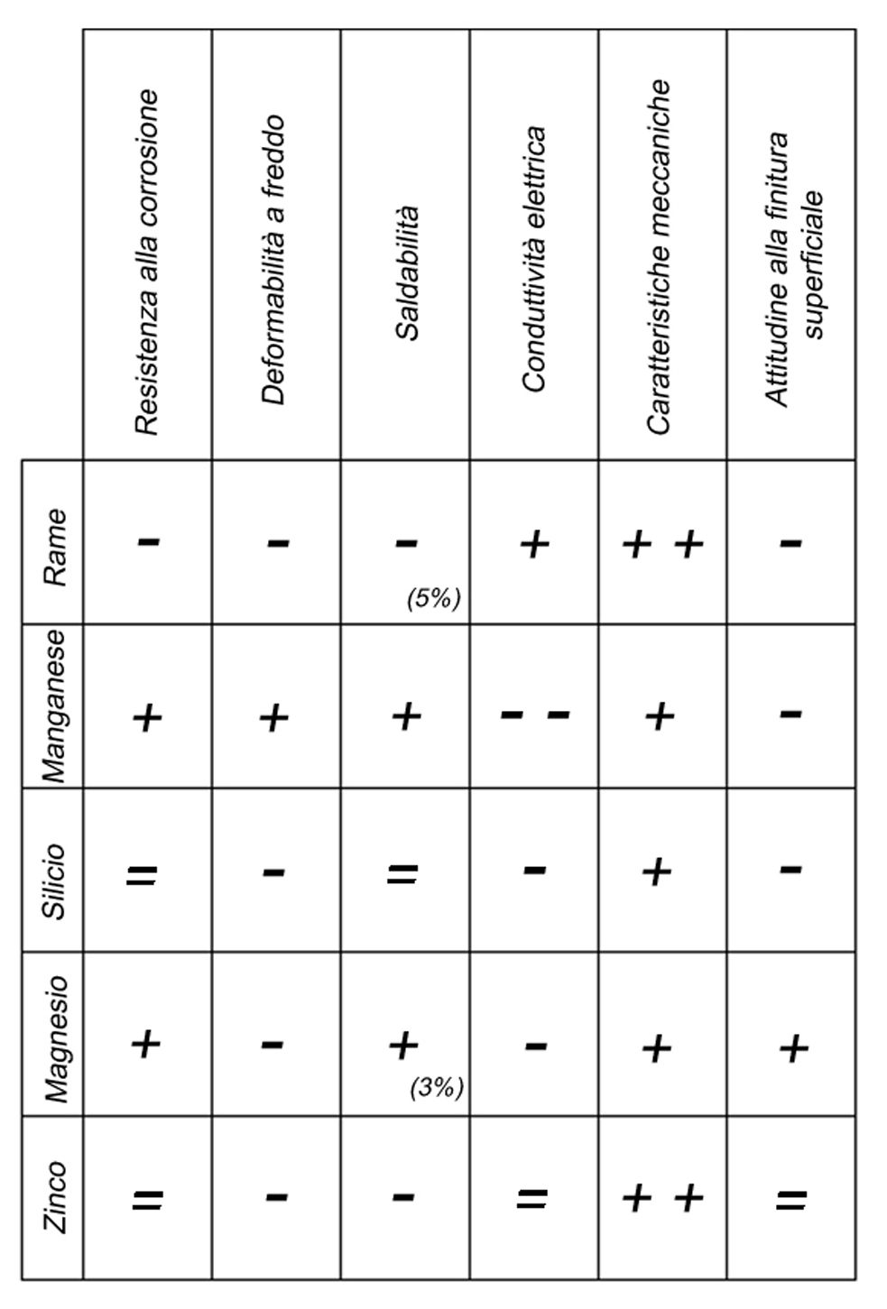 Aumenta la resistenza e la durezza in rapporto alla quantità presente nella lega; per tenori di rame al di sopra del 12% la lega presenta una spiccata fragilità. La presenza del rame migliora la lavorabilità, tuttavia diminuisce la resistenza alla corrosione, pur in piccole percentuali. - Silicio (Si)