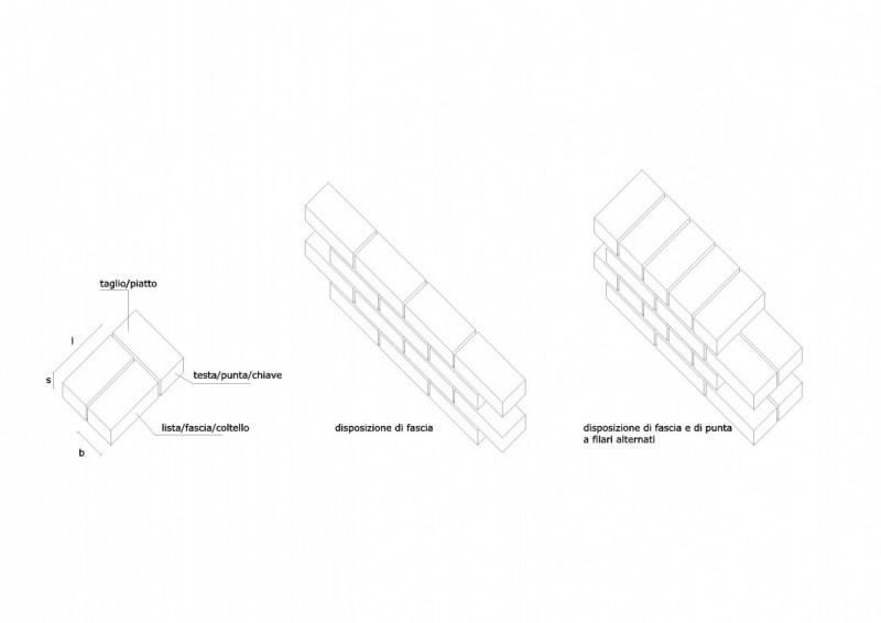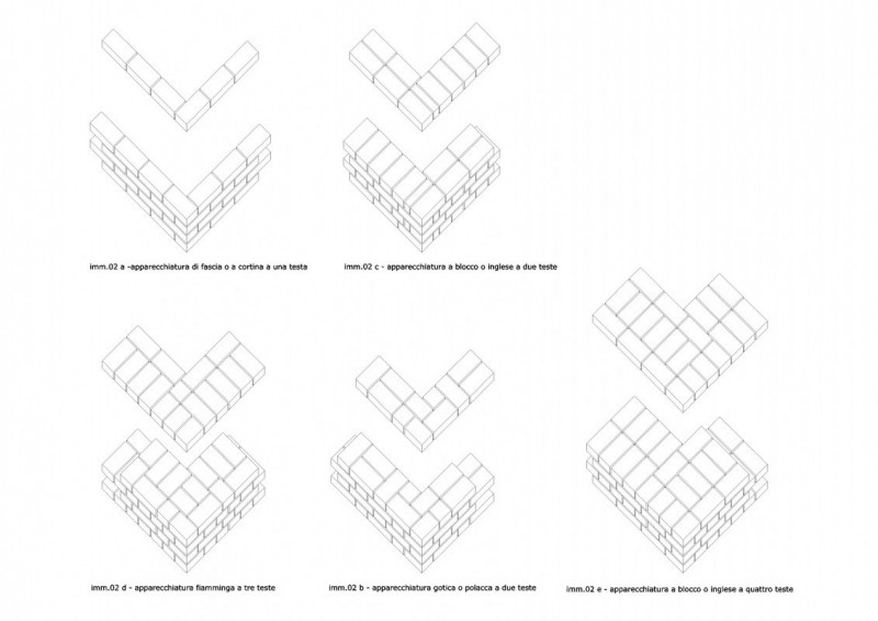 Il tipo di apparecchiatura più semplice è quella della muratura ad una testa, nella quale i mattoni vengono disposti a formare una muratura di 12 cm di spessore con fasce sovrapposte alternate di mezzo mattone in modo da permettere la discontinuità dei giunti. La tessitura di facciata (detta a cortina) si presenta con i mattoni disposti tutti di lista (o di fascia), ovvero secondo il lato lungo. L’apparecchiatura a due teste, invece, prevede che i mattoni vengano disposti di testa a formare una muratura di 25 cm di spessore, sempre con fasce sovrapposte alternate. La tessitura di facciata (detta di testa) si presenta con il lato corto (12 cm) del mattone a vista ed è caratterizzata da una presenza molteplice di giunti verticali che rendono la muratura stessa poco adatta alle alte sollecitazioni. La muratura a due teste, proprio per ovviare a questa problematica, può presentarsi con differenti apparecchiature degli elementi. Tra le più conosciute ci sono l’apparecchiatura a due teste fiamminga (o olandese), nella quale ad un corso di mattoni messi di testa fa seguito un corso di mattoni messi di fascia, in modo da ridurre il numero dei giunti verticali ed ottenere una tessitura a corsi alternati. Sempre con la stessa funzione vanno citate l’apparecchiatura gotica (o polacca), a blocco (o inglese) e a croce. L’apparecchiatura a tre teste prevede che per ogni corso ci siano mattoni disposti di testa e di fascia, fino ad arrivare allo spessore di 38 cm (25+1+12 cm). La tessitura di facciata in questo caso è differente a seconda del punto di osservazione (ad esempio esterno o interno) ma prevede sempre l’alternanza dei giunti verticali. Oggi difficilmente si realizzano apparecchiature murarie superiori alle tre teste ma è possibile trovare pareti di edifici storici realizzati anche a quattro teste. Un particolare tipo di apparecchiatura muraria è quella denominato “muratura listata”. Questa tipologia di apparecchiatura prevede l’uso di blocchi di pietra non squadrata intervallati da liste di mattoni di laterizio. I mattoni hanno la funzione di regolarizzare (ad altezze solitamente di 1 m) la muratura in pietra e formare un piano da cui ripartire per la costruzione della muratura.